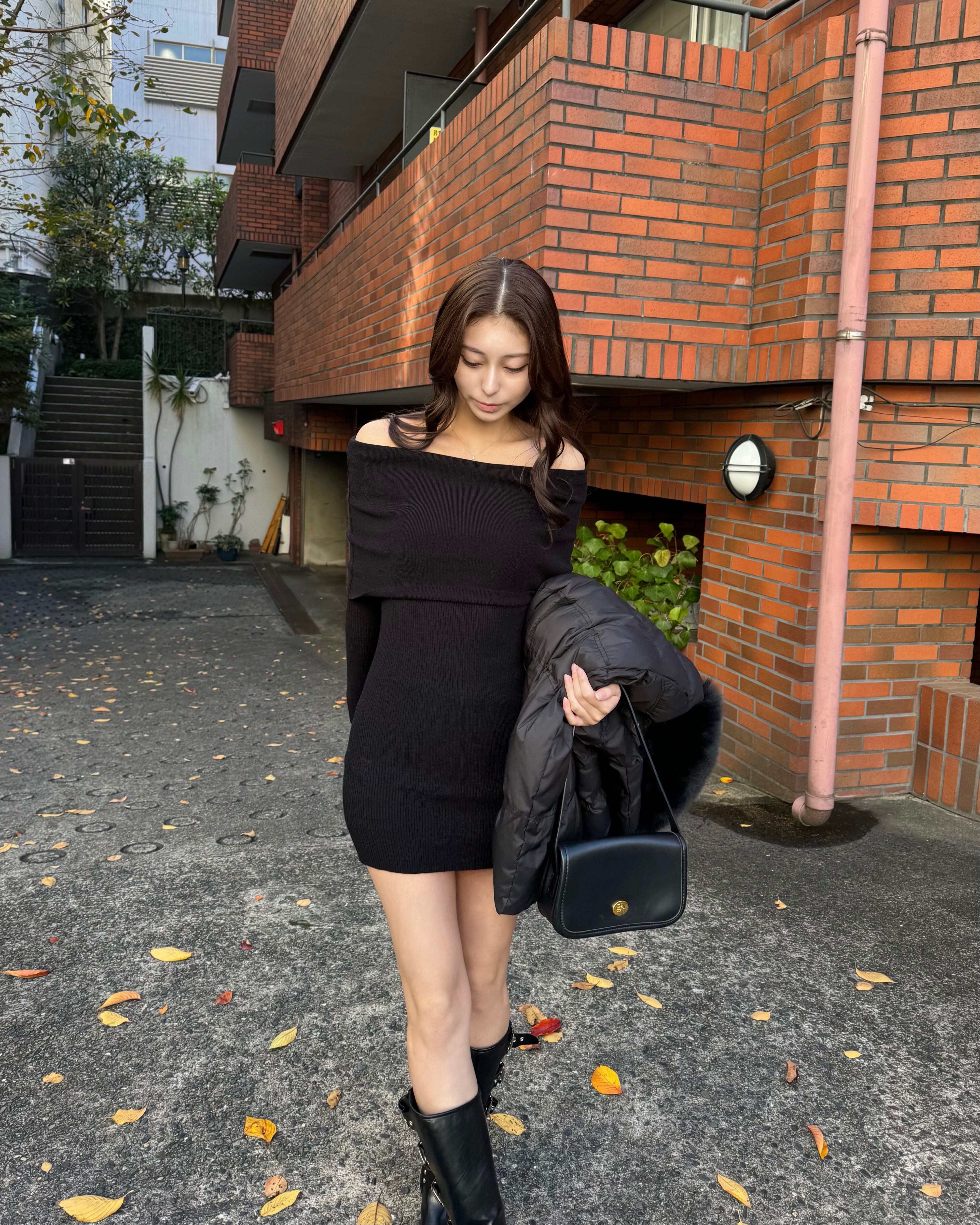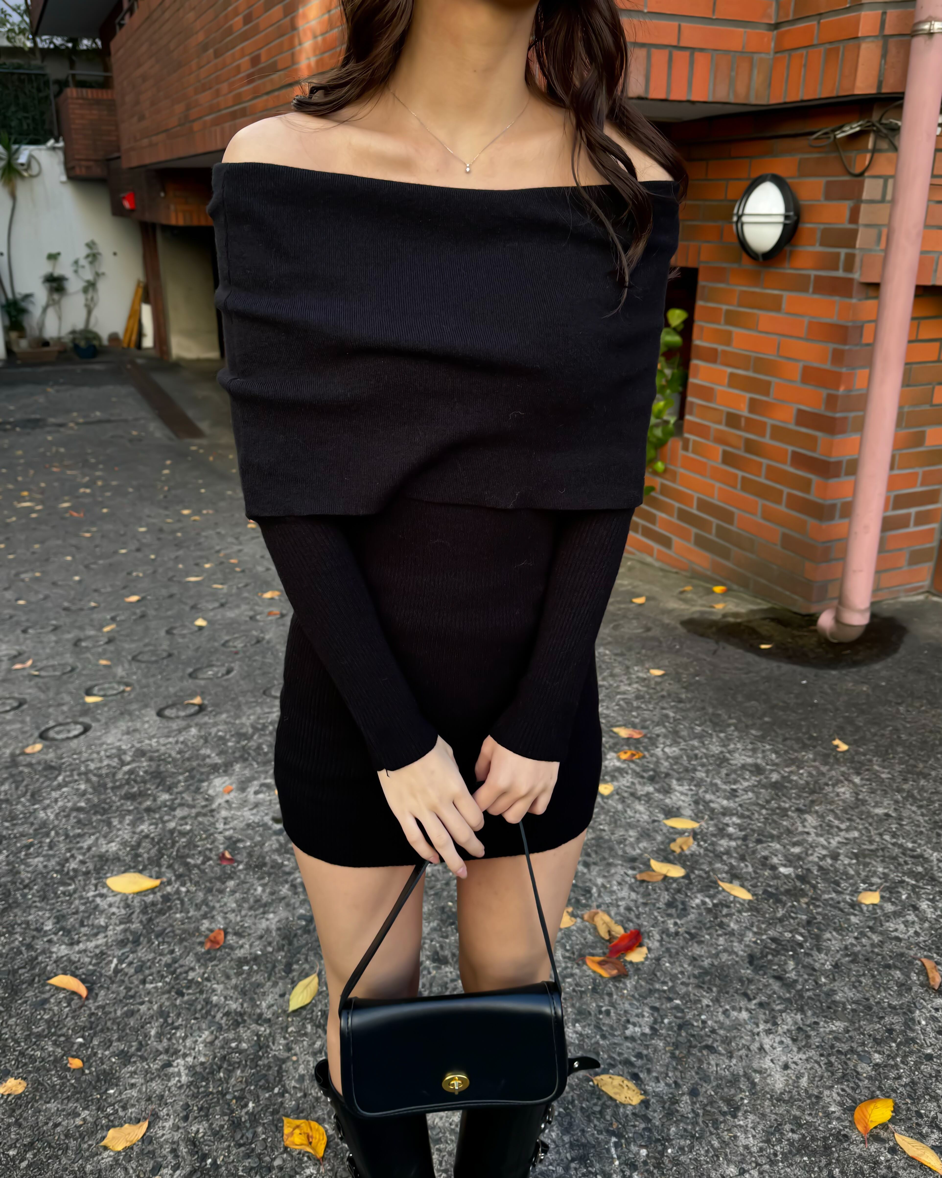 柔らかなリブニットのオフショルダーミニワンピース。