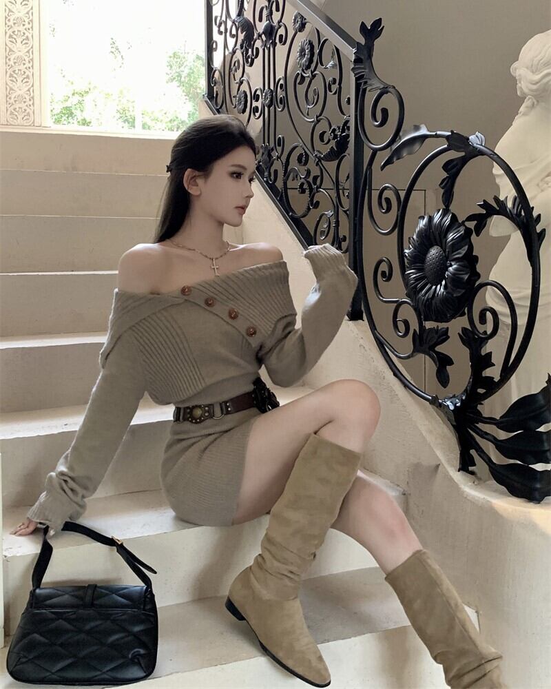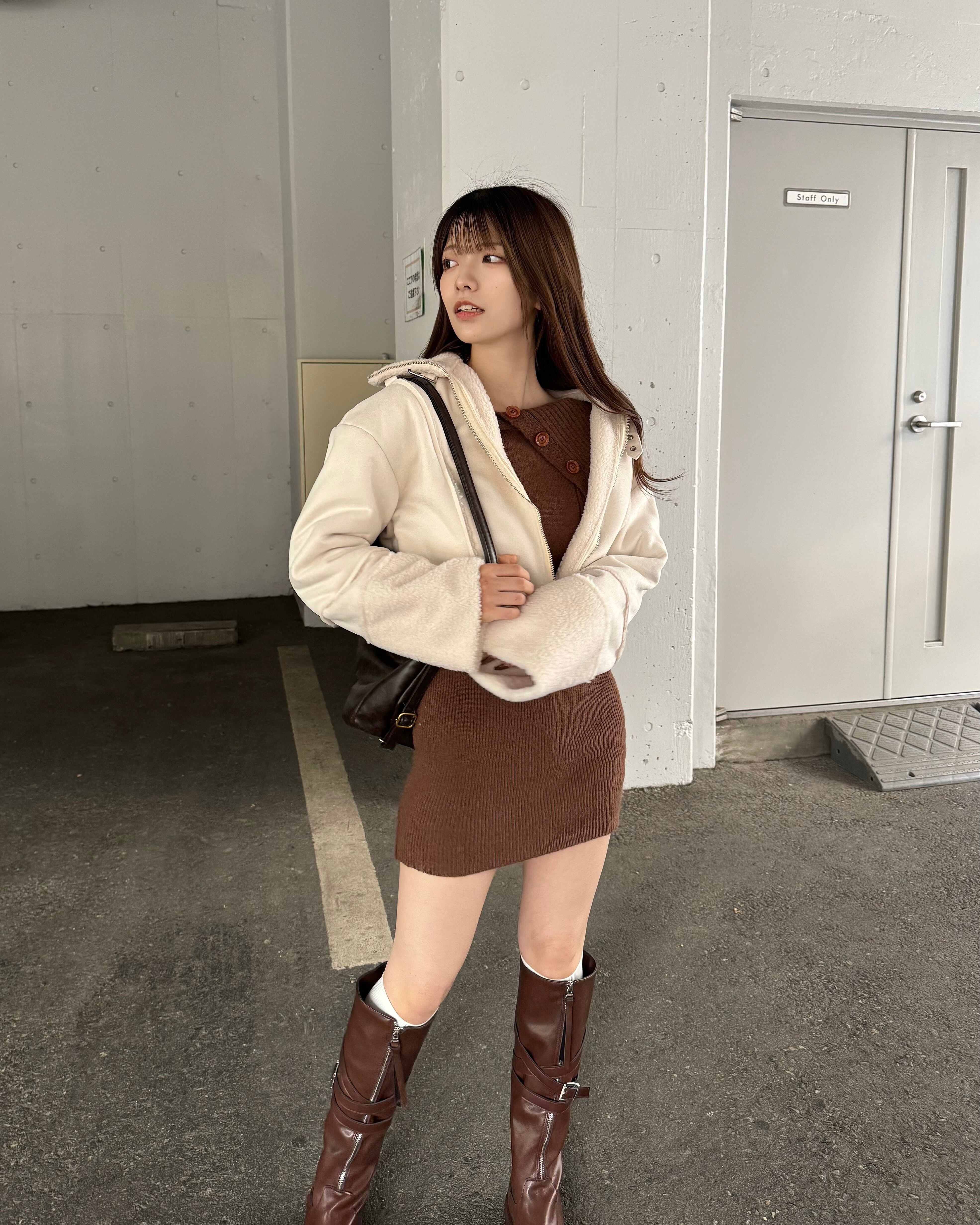ゆったり目のトップに、タイトなスカートでスタイルアップ。